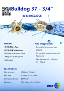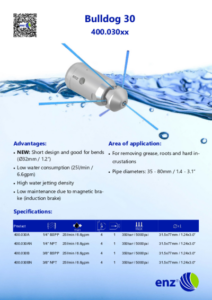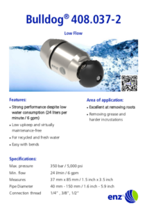 La buse rotative enz® Bulldog® a été conçue pour fonctionner avec de l’eau recyclée et de l’eau douce. Le palier coulissant astucieusement construit permet l’utilisation de tous types d’eau recyclée. Un système de freinage intégré sans huile entraîne une faible usure et un nombre de rotations contrôlé. Cela permet d’obtenir un nettoyage des tuyaux à la fois efficace et économique. Le diamètre de l’orifice de la buse détermine la taille maximale des particules de saleté pouvant passer, jusqu’à Ø 1 mm.