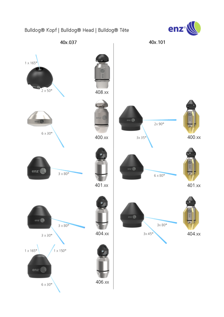 La buse rotative enz® Bulldog® a été conçue pour fonctionner avec de l’eau recyclée et de l’eau douce. Le palier coulissant astucieusement construit permet l’utilisation de tous types d’eau recyclée. Un système de freinage intégré sans huile entraîne une faible usure et un nombre de rotations contrôlé. Cela permet d’obtenir un nettoyage des tuyaux à la fois efficace et économique. Le diamètre de l’orifice de la buse détermine la taille maximale des particules de saleté pouvant passer, jusqu’à Ø 1 mm.