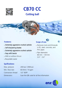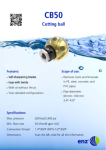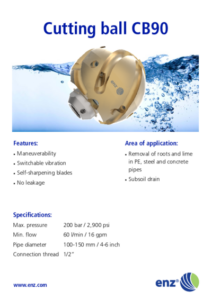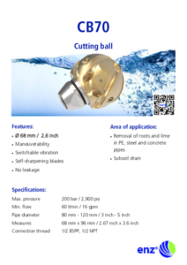 La gamme CB (boule de coupe enz®) est équipée d’un couteau ou d’une lame pénétrante en carbure pour les conduites obstruées à plus de 50 %. Les CB90 et CB70 (boule de coupe enz®) fonctionnent sans impact, mais sont équipées d’un bouchon amovible qui crée une vibration dans l’outil lors de la rotation (pas le CB50). Les couteaux latéraux sont auto-affûtants et conservent leur tranchant pendant toute leur durée de vie. La zone d’application de la boule de coupe est très variée. Grâce à sa forme sphérique, elle navigue facilement dans les coudes sans endommager la conduite. De plus, le système de freinage éprouvé d’enz® garantit une vitesse de rotation réduite. Les CB90 et CB70 sont étanches et peuvent être utilisées avec de l’eau recyclée.