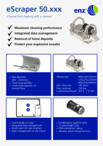 La résolution HD-ready et les 12 LED haute puissance offrent des images vidéo de haute qualité pour le contrôle qualité, la documentation et les inspections préliminaires. La gestion des données est entièrement intégrée au système via l’interface WiFi et la connexion au cloud enz®. Tous vos regards et canaux sont automatiquement cartographiés sur Google Maps avec les vidéos. Simple, rapide et robuste, la buse caméra enz® augmente la productivité sans affecter la performance ou la qualité du nettoyage.