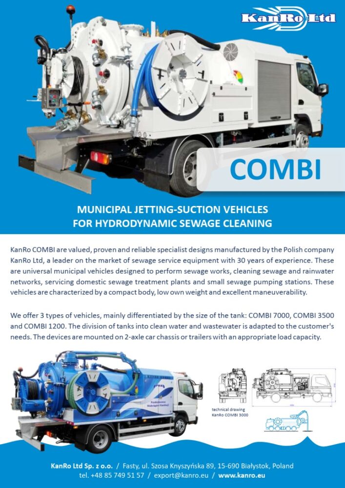 Le véhicule de nettoyage des égouts KanRo COMBI 3500 est une construction bien connue depuis de nombreuses années, produite et proposée en Pologne par KanRo Ltd®. Ces unités combinées Jetting/Vacuum utilisent un jet d’eau à haute pression combiné à une source d’aspiration à haut débit pour nettoyer les canalisations et les égouts, puis aspirer les matériaux, ce qui permet de maintenir un flux normal dans les égouts. Le fonctionnement du véhicule a été conçu pour une manipulation simple. Il se caractérise par une construction compacte, un faible poids propre et une excellente maniabilité. Conforme à toutes les réglementations routières, y compris celles concernant la charge utile maximale, le poids total et les charges maximales par essieu.