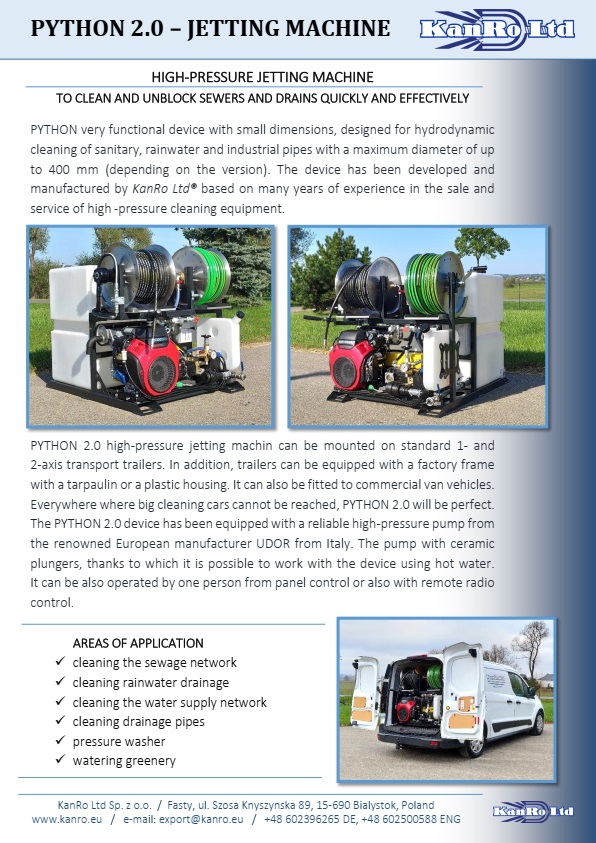 PYTHON 2.0 appareil très fonctionnel de petites dimensions, conçu pour le nettoyage hydrodynamique des canalisations sanitaires, pluviales et industrielles d’un diamètre maximal allant jusqu’à 400 mm (selon la version). L’appareil a été développé et fabriqué par KanRo Ltd® sur la base de nombreuses années d’expérience dans la vente et le service d’équipements de nettoyage haute pression.