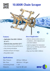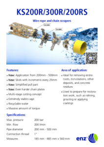 Le grattoir à chaîne enz® est un appareil polyvalent, simple à utiliser et à entretenir. Plusieurs diamètres de tuyaux peuvent être nettoyés avec le même outil. Les couches de dépôts minéraux et les résidus de béton sont éliminés efficacement.